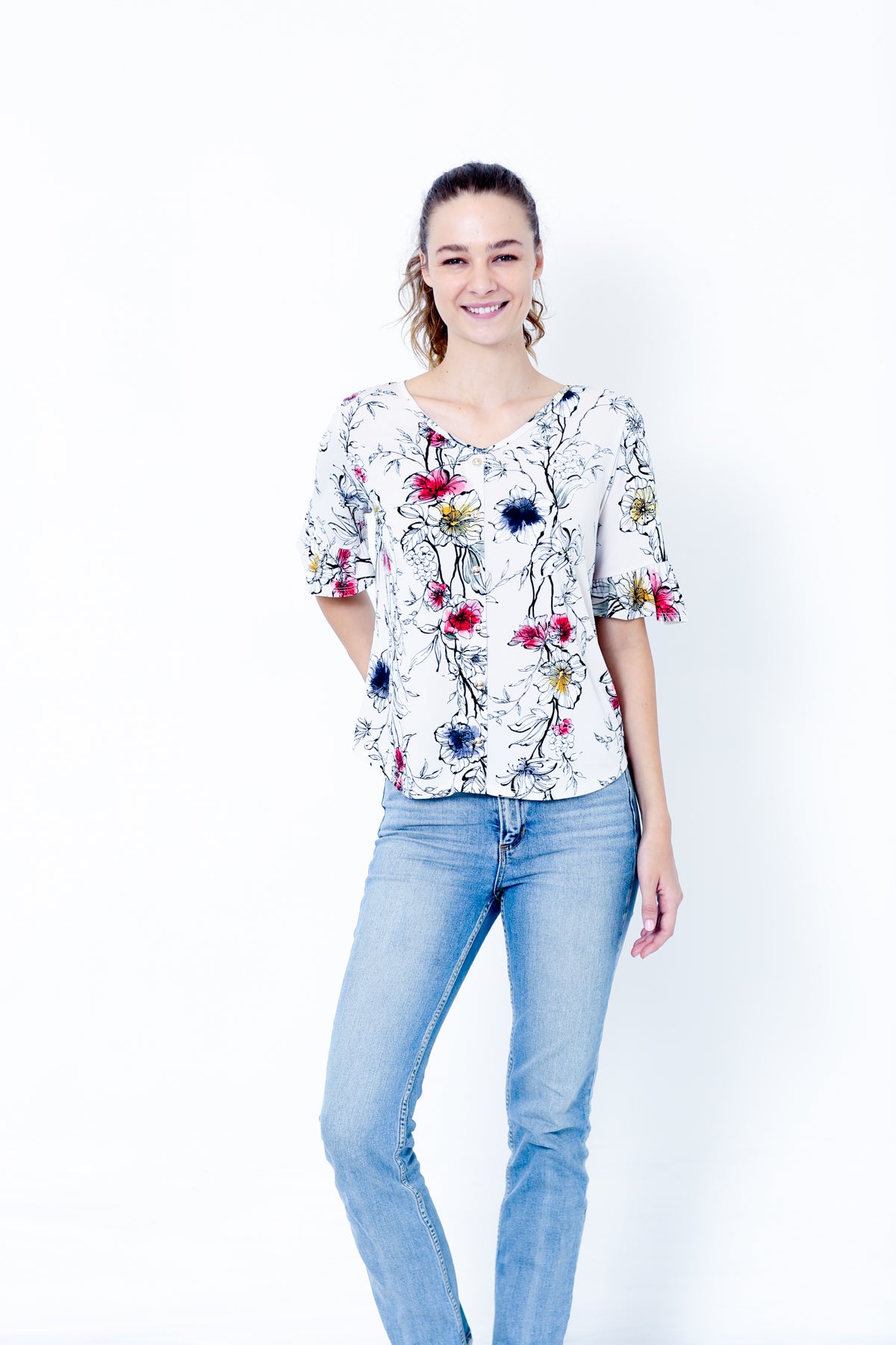 PUFF ITY Ivory floral elbow sleeve top with flutter and buttons.