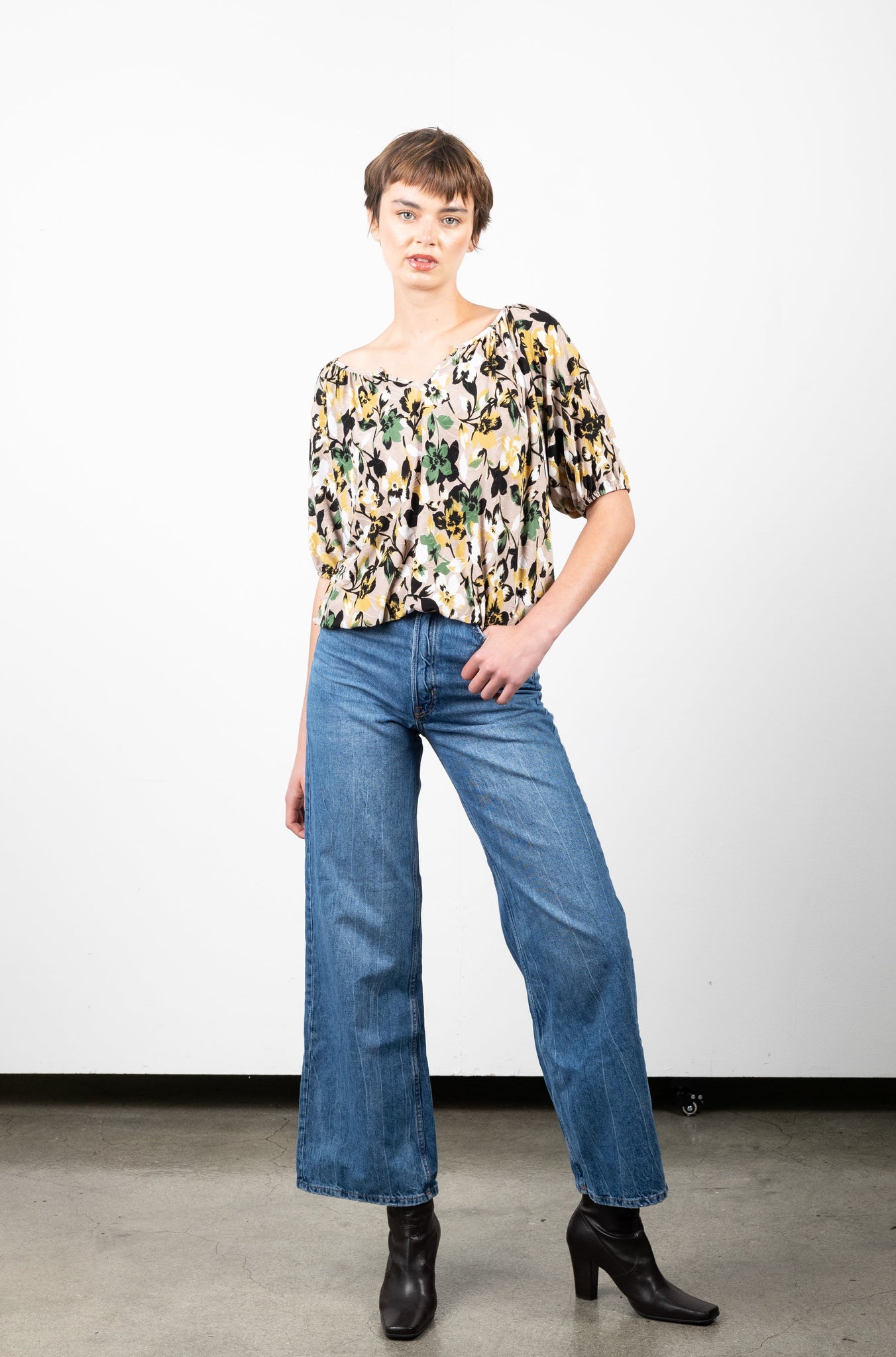 JACQUARD ITY Beige floral print elbow notched neck peasant balloon top.