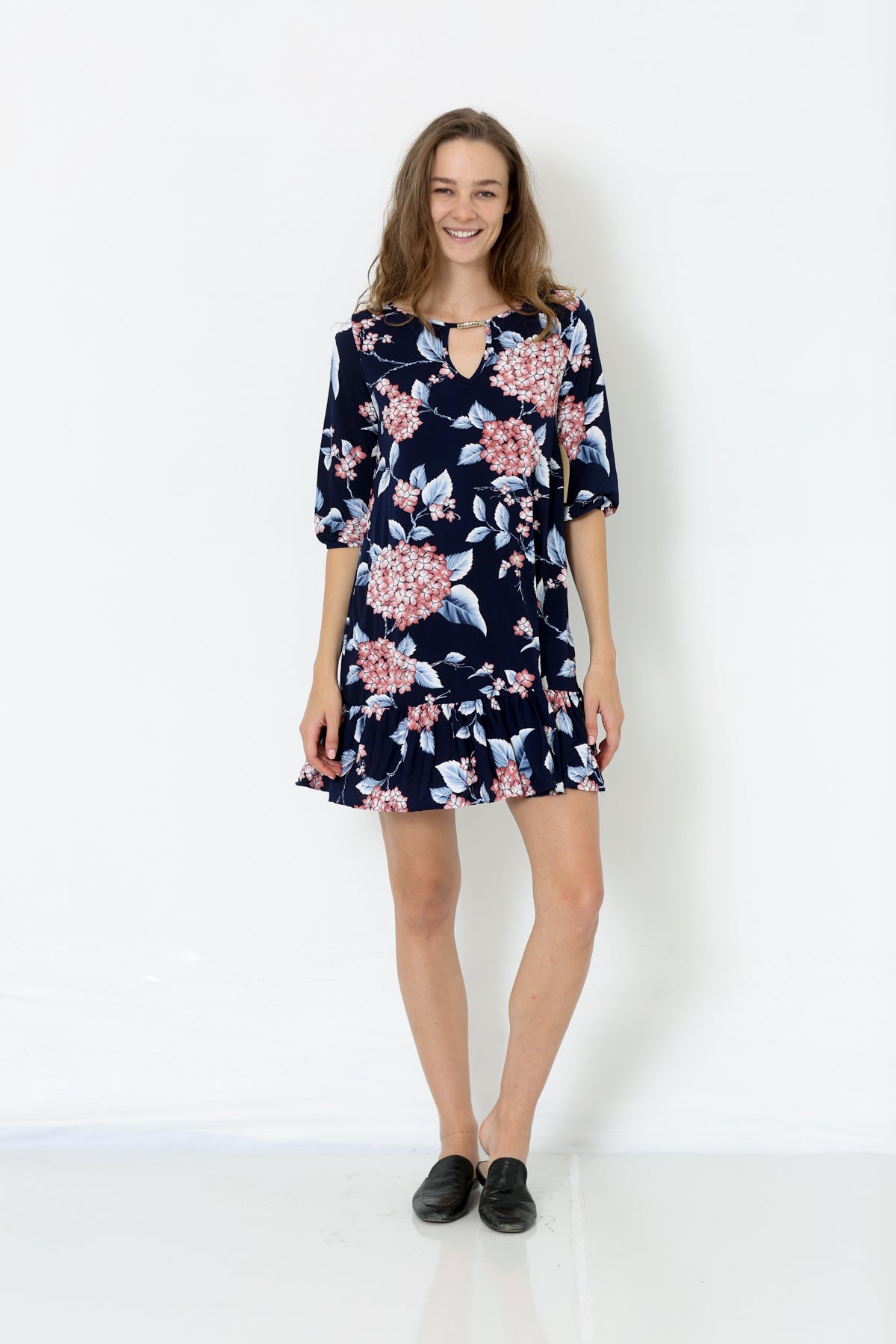 PUFF ITY Navy blue pink floral elbow puff sleeve key hole neck line dress.