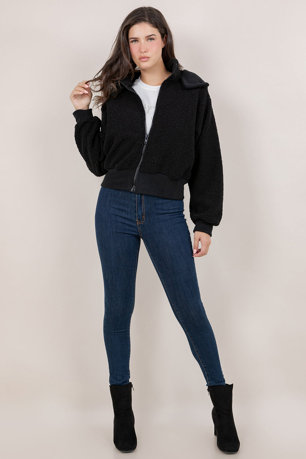 This sherpa long sleeve cropped bomber jacket features a plush, textured fabric throughout for exceptional warmth and comfort. Its hooded design, zip-up front, and stand collar offer both protection from the elements and a sleek, modern look. With a cropped silhouette, this jacket balances functionality and style, making it a refined choice for layering in cooler weather.