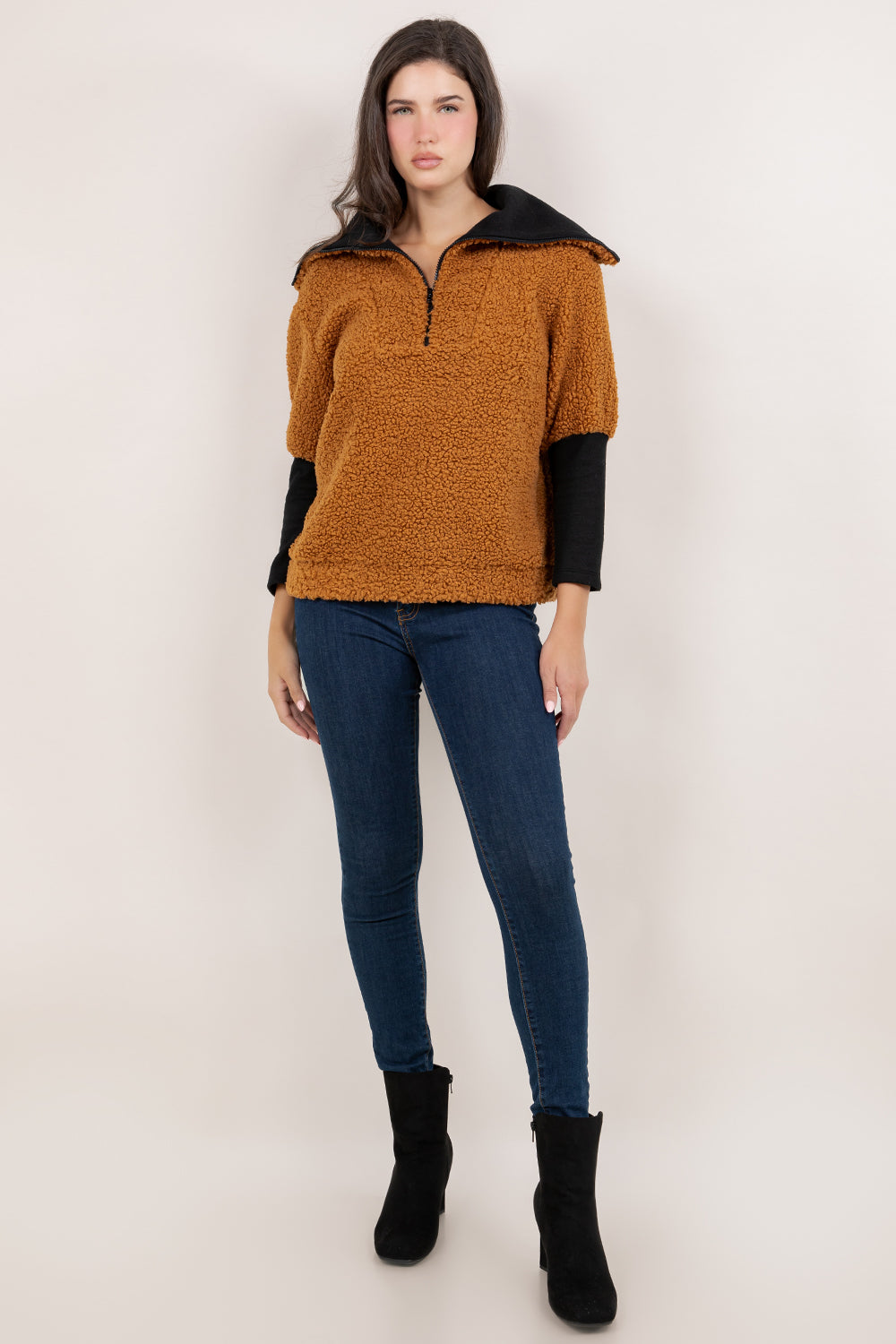 This oversized pullover jacket features a distinctive fold-over collar and a practical half-zip front, designed for both style and ease of wear. The contrasting sleeves add a modern touch to its classic Sherpa fabric, providing warmth and a comfortable fit. Ideal for layering, this jacket blends functionality with contemporary design to elevate your casual wardrobe.