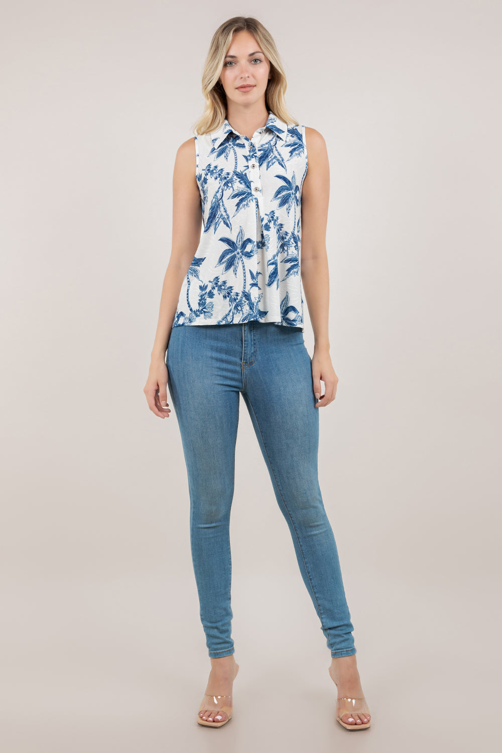 This sleeveless collared top delivers effortless sophistication with its relaxed silhouette and thoughtful design details. The half-buttoned placket offers versatile styling options—wear it fully fastened for a polished look or partially unbuttoned for casual ease. An inverted front pleat adds subtle dimension and movement, while the structured shirt collar elevates the piece beyond basic basics. Perfect for layering or wearing solo, this wardrobe staple transitions seamlessly from office to weekend.