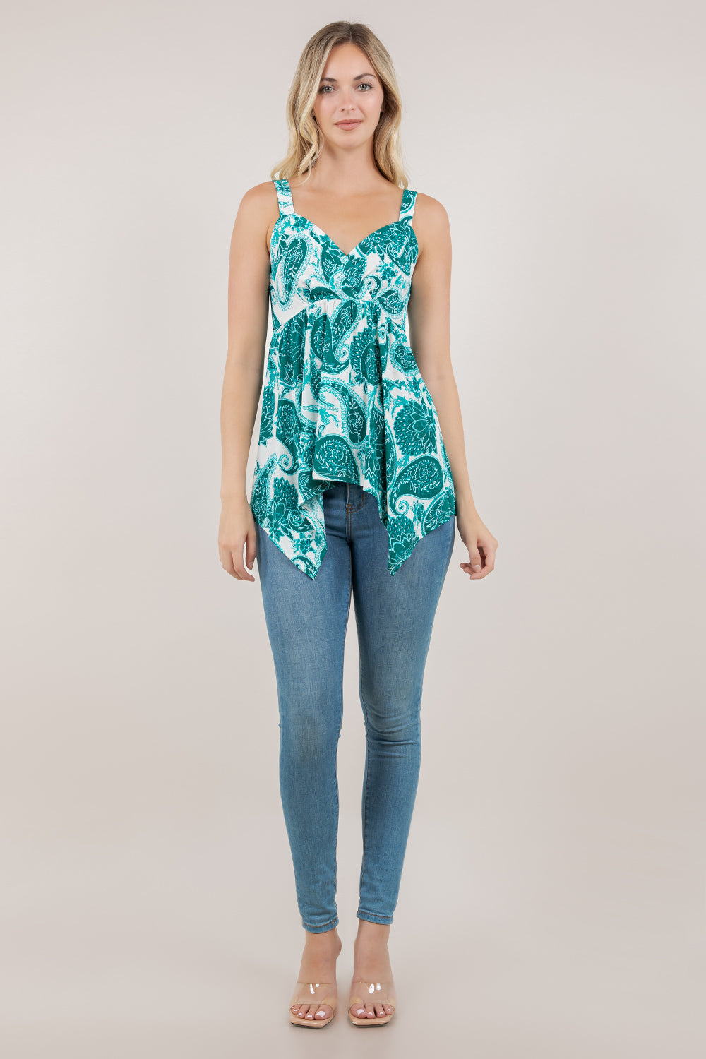 This sleeveless top showcases contemporary design through thoughtful details. The surplice neckline creates a flattering crossover silhouette that defines the torso while offering versatile styling options. Substantial two-inch straps provide comfortable support and a modern aesthetic. The sharkbite hem—with its distinctive angled cut—adds movement and visual intrigue, preventing a predictable finish. Ideal for layering or wearing as a standalone piece, this top transitions effortlessly from day to evening wear.