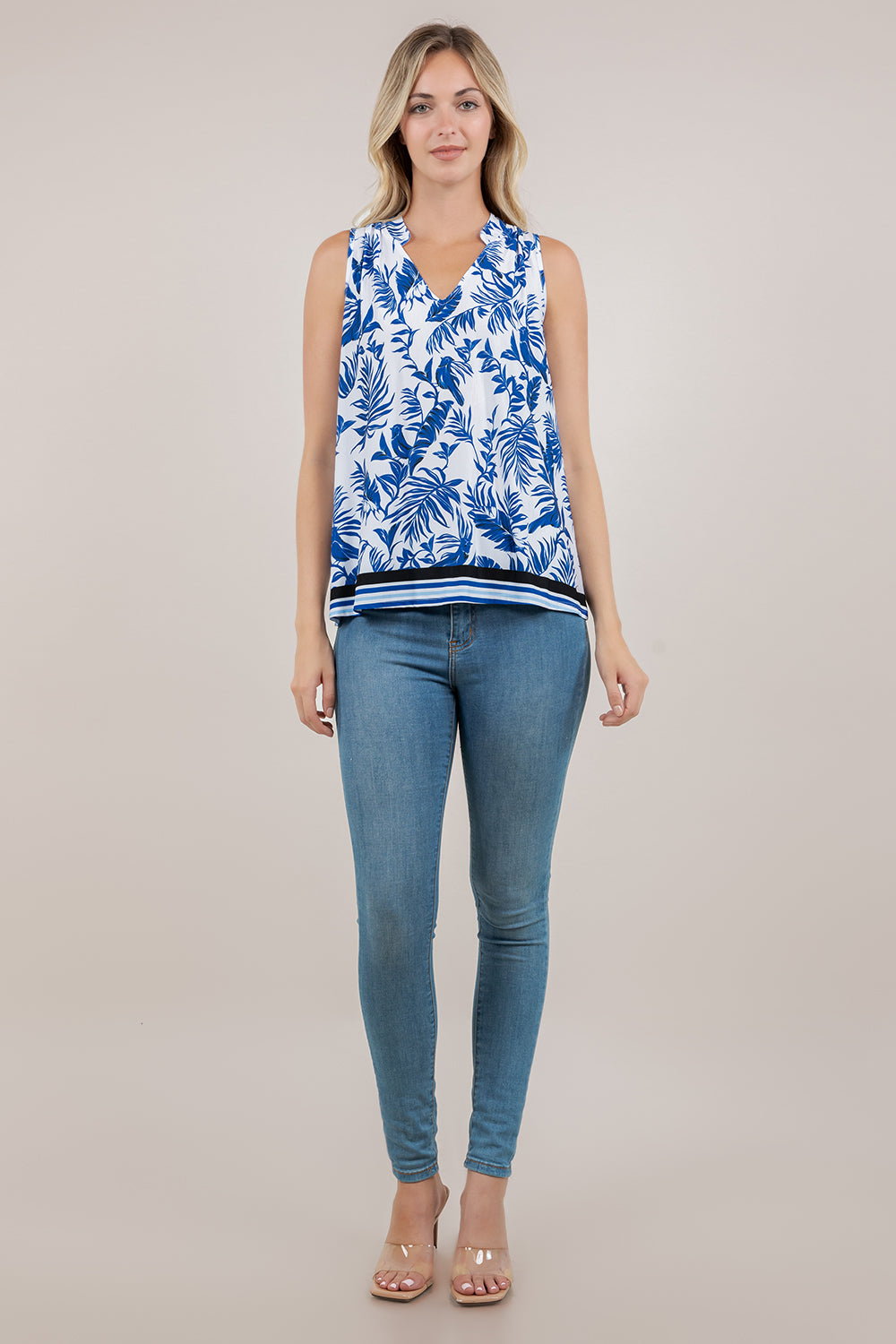 This sleeveless popover top features a striking deep V neckline framed by a structured mandarin collar, creating a sophisticated silhouette. Strategically placed shoulder pleats add dimensional drape and movement, elevating the design beyond basic basics. The relaxed fit ensures comfortable all-day wear while maintaining a polished aesthetic. Perfect for layering or wearing solo, this versatile piece transitions seamlessly from office to weekend.