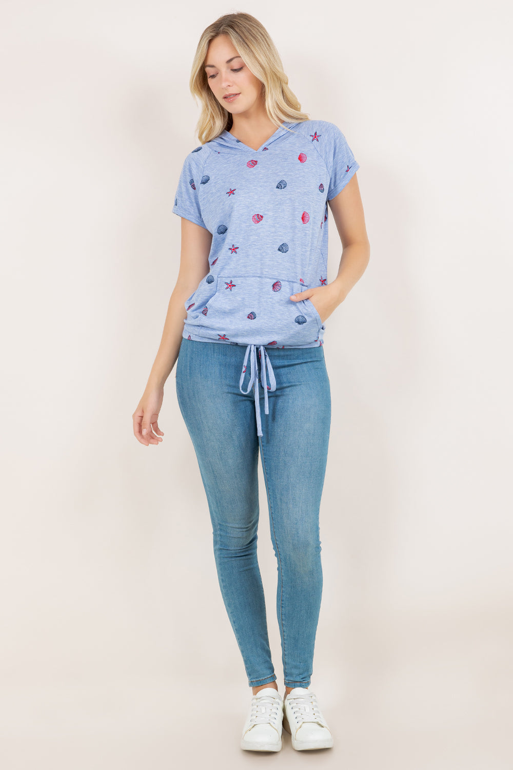 This short sleeve raglan hoodie features an elastic waistband hem with adjustable drawstrings for a customizable fit. Designed with a convenient kangaroo pocket on the front, it combines comfort and functionality in a lightweight, sporty style.
