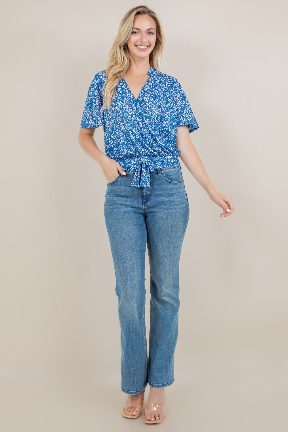 This short bell sleeve wrap surplice top features a deep V neckline with a collar stand for a refined silhouette. The adjustable sash allows for a customizable fit, while the elastic waist enhances comfort and shape. Perfect for layering or wearing alone, it combines style and ease for a polished look.