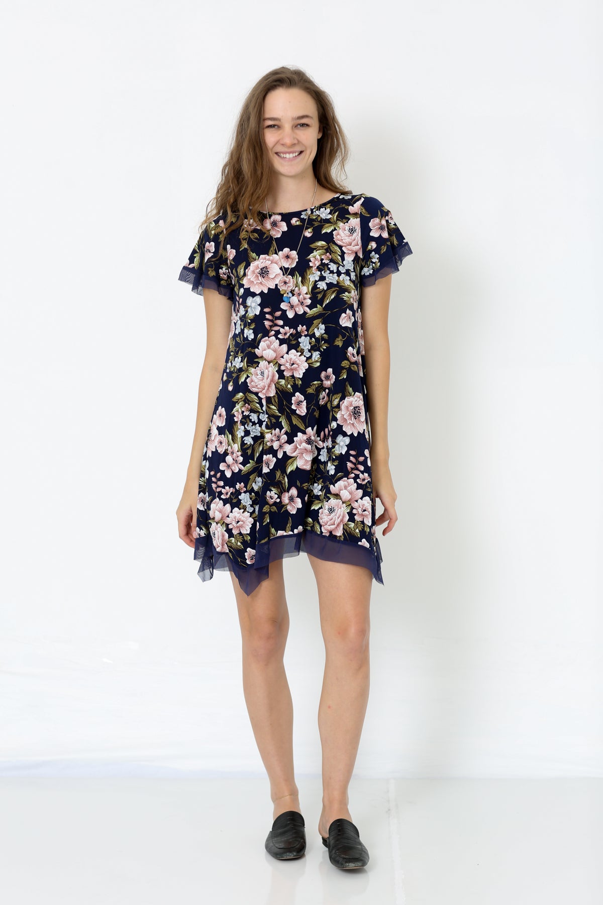 JACQUARD ITY Navy line floral short sleeve contrast hanky hem midi dress.