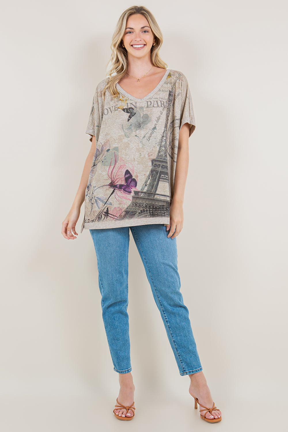 PRS Heather oatmeal eiffel tower floral short sleeve dolman swoop V-neck step hem top.