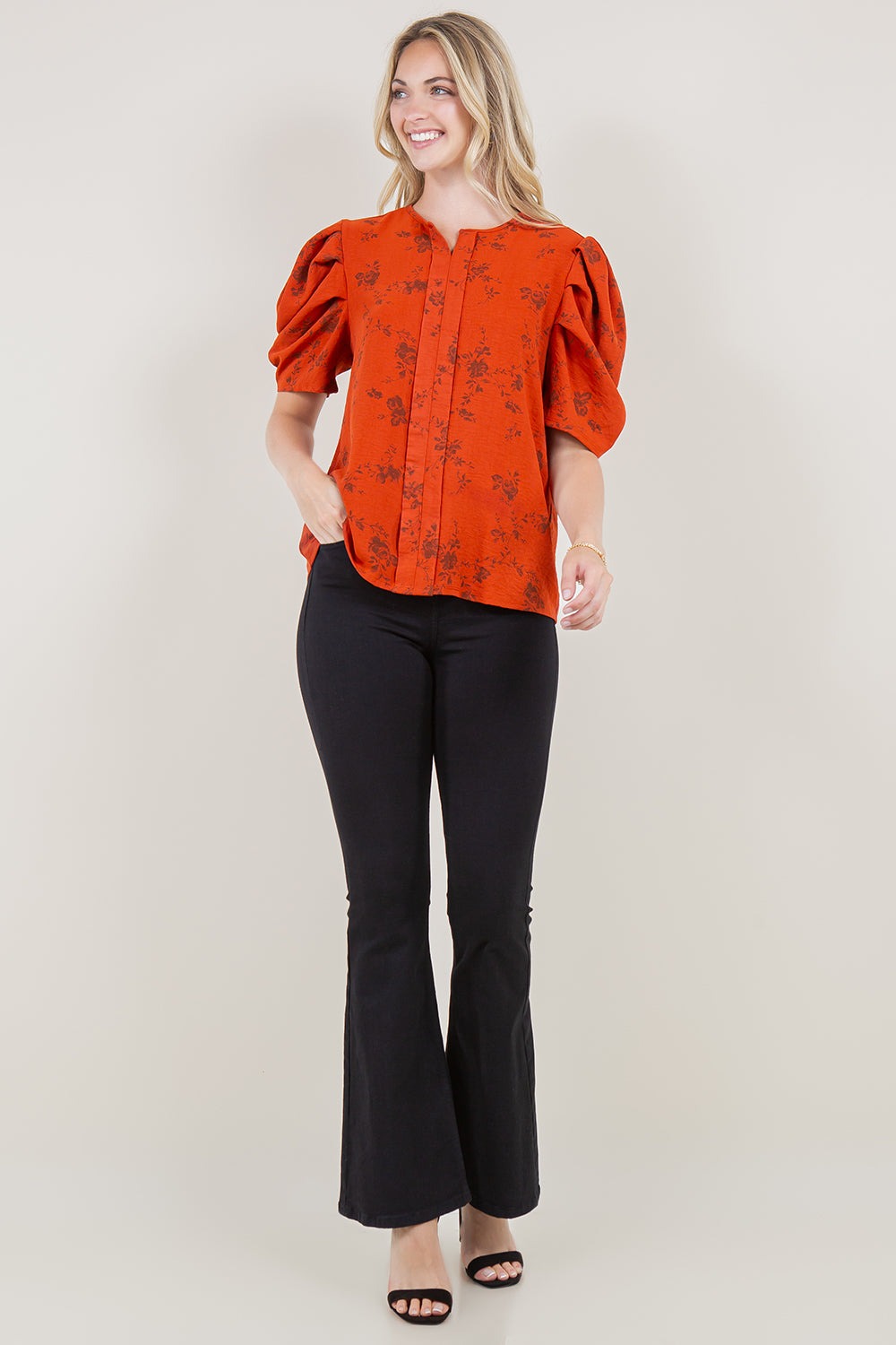 PIGMENT PRINT AIRFLOW Rust short sleeve pleated puff sleeve notch neck placket top.