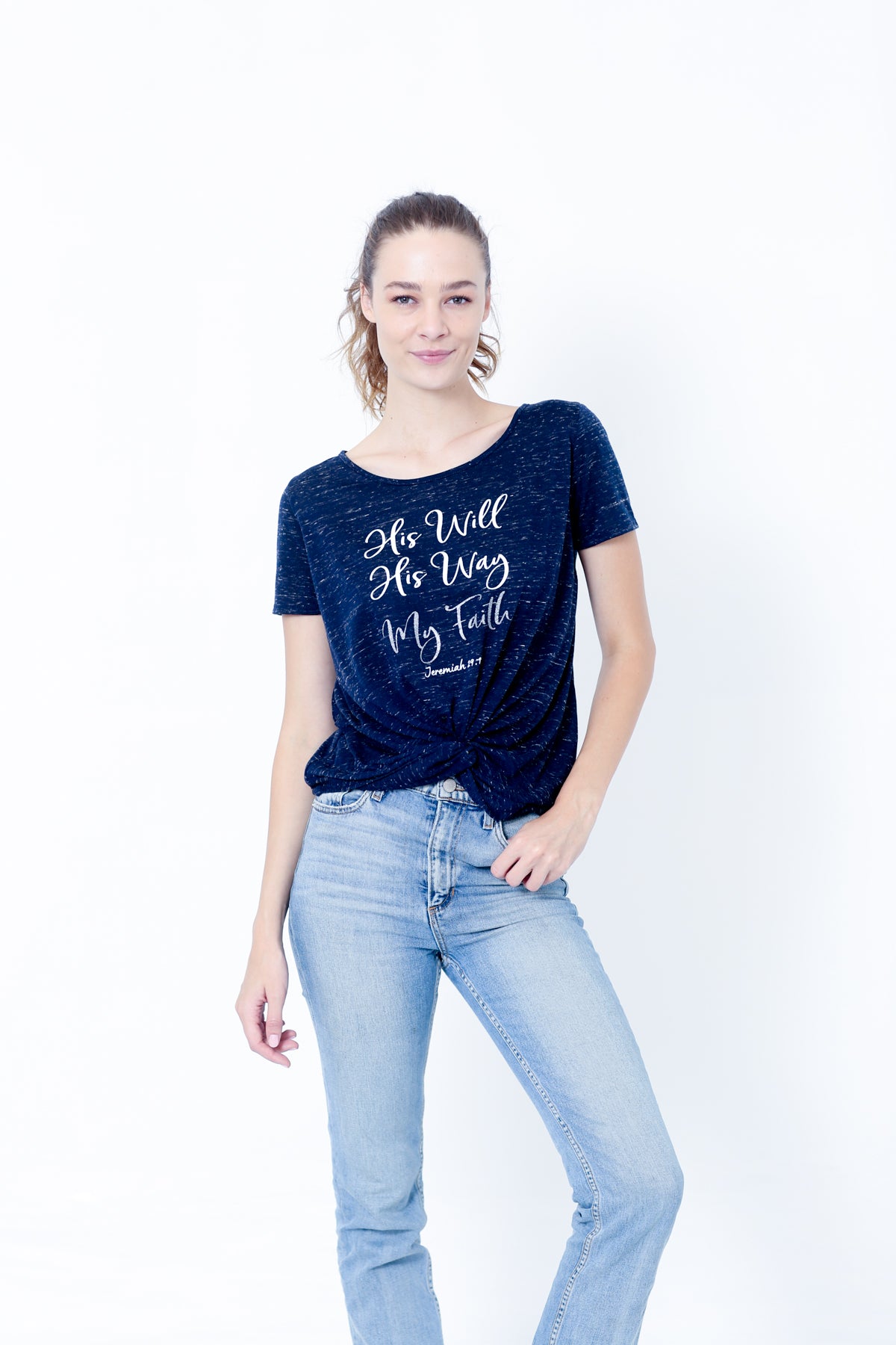 SPACE DYE JERSEY Navy short sleeve round neck twist front top.