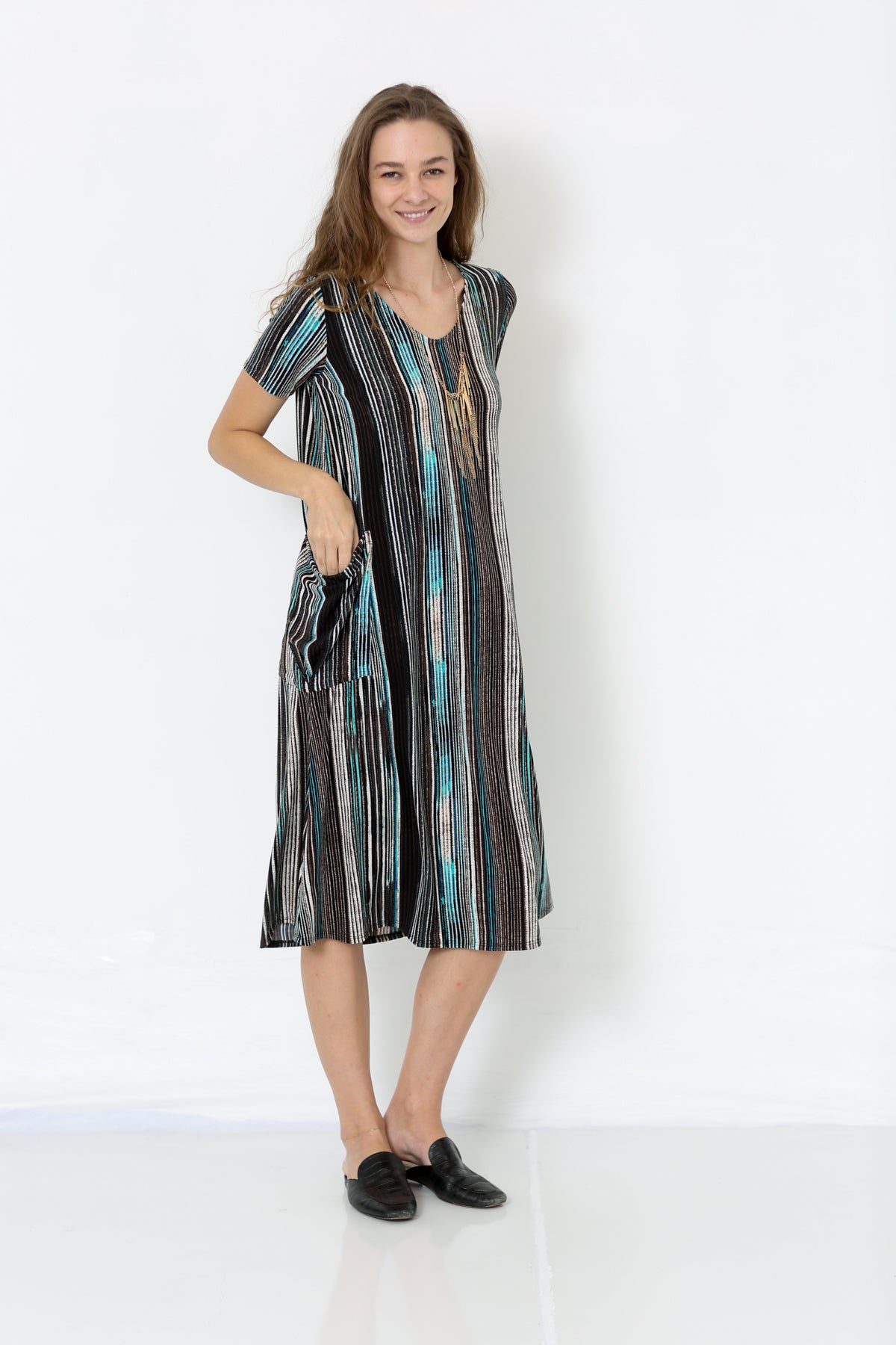 PUFF ITY Teal taupe stripe short sleeve V-neck patch pocket dress.